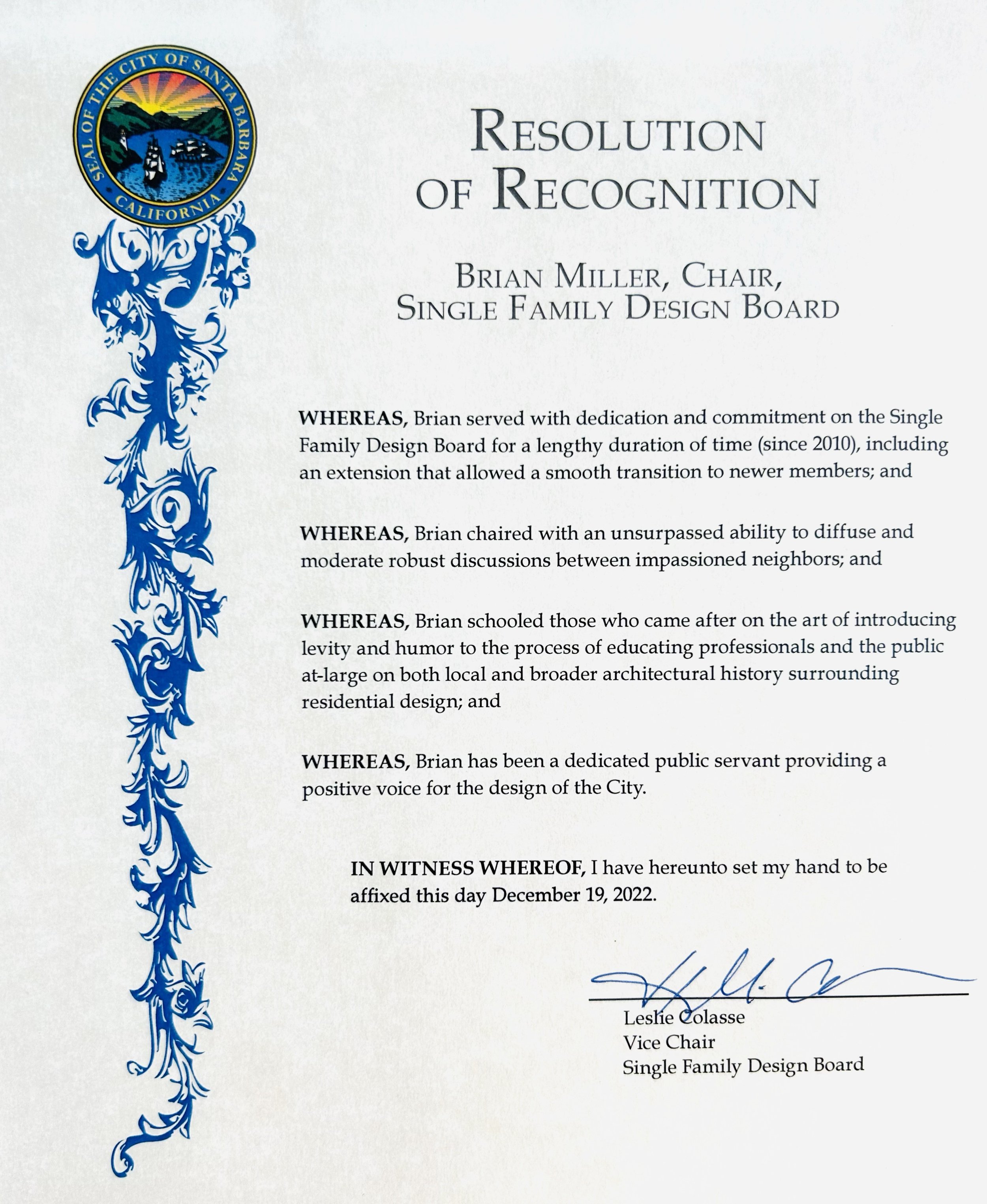 Special recognition for 14 years of service on the Santa Barbara Single Family Design Board.